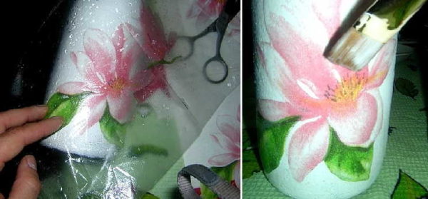 Найдя тот участок, куда вы хотите поместить украшение, прикладываем рисунок на пленке и начинаем его приглаживать. Это очень непростой момент. Надо добиться чтобы прилип хотя-бы один край салфетки. После того как зафиксировался один из краев изображения, постепенно приглаживая и приподнимая понемногу край пленки, добиваемся чтобы салфетка осталась на основании. Если действовать постепенно, понемногу приклеивая картинку к основанию, пузырьков или складочек не возникает. Этот способ подходит как декупаж для начинающих.