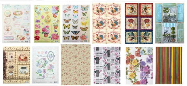 - Карты для декупажа на бумаге. Используется обычная бумага, на которую нанесены рисунки. Хороши при наклеивании на ровные поверхности, так как практически не тянутся. Отличается не только размерами и рисунками, но и плотностью. Стоимость бумажных карт для декупажа — от 35 рублей.