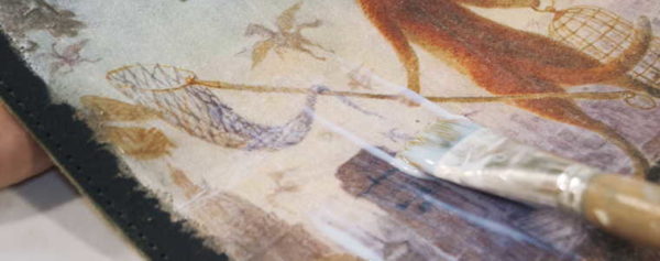 Если поверхность декорируется мелкими рваными фрагментами, из которых надо получить единое целое, кисточкой или пальцами расправляем края фрагментов. Если где-то есть неоднородность цвета, разводим краску нужного оттенка и прокрашиваем просвечивающееся основание.