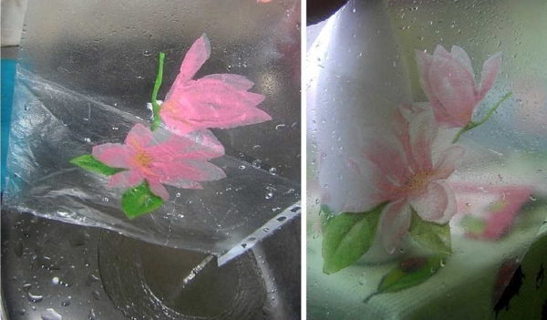 Когда фрагмент расправлен, приподнимаем края файла и сливаем воду. Рисунок остается прилипшим к гладкой пленке. В таком состоянии удобно «примерять» и искать лучшее для него место.