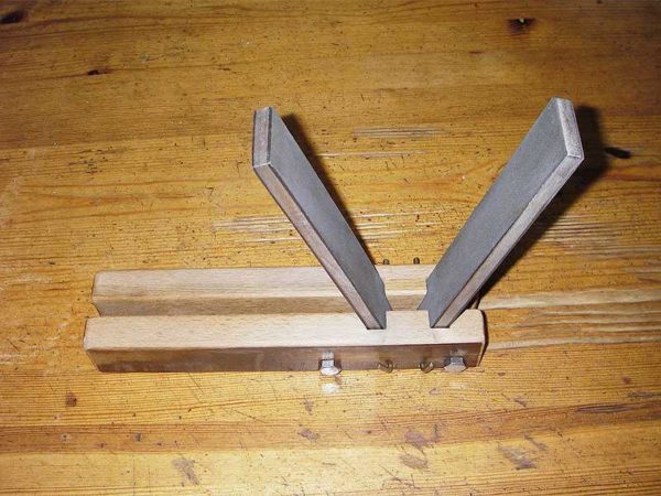 По сути это держатель для точильных брусков. Все элементарно: два треугольника из древесины, которые соединяются шпильками с «барашками». Между углами зажимается брусок под требуемым углом. Выставлять угол можно пользуясь транспортиром, специальной программой на смартфоне или пользуясь правилами тригонометрии (прямоугольный треугольник).