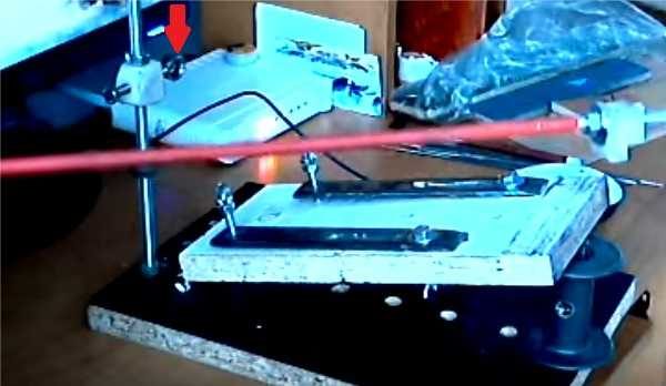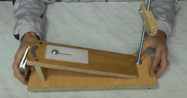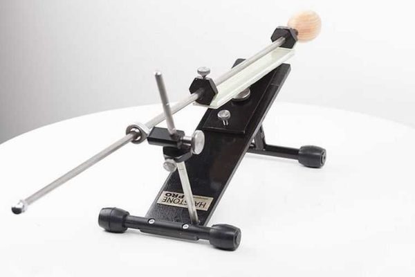Чуть более сложные и гораздо более удобные самодельные устройства, которые сделаны на основе известных фирменных приспособлений. В них есть регулируемая площадка, на которой закрепляется нож. Площадка выставляется под заданным углом. Брусок крепится на подвижной штанге, прикрепленной к стойке.
