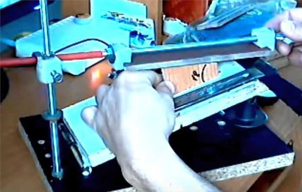 При заточке на таком приспособлении нож надо держать все время направленным строго вертикально. Это намного проще, чем удерживать его под определенным углом.