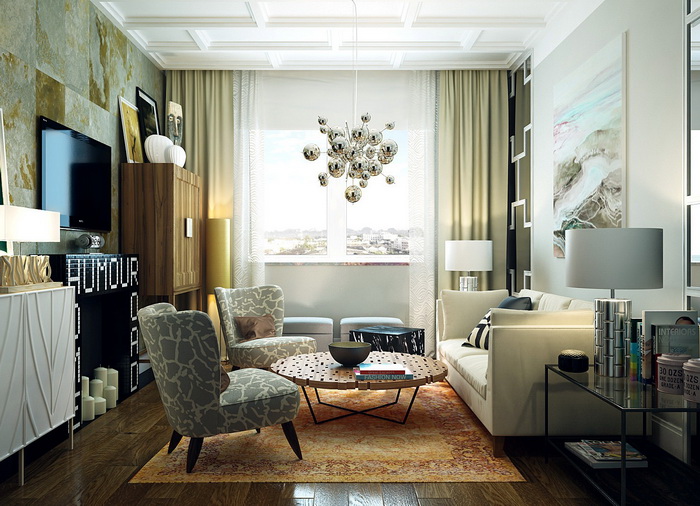 Здесь каждый предмет мебели имеет свой зрительный вес и располагается на определенном расстоянии от выбранного функционального центра, например, окна, камина или телевизора. Нужно рассматривать положение предметов с различных точек, сдвигая более крупные или яркие — визуально «тяжелые» предметы ближе к фокусному центру и удаляя от него более зрительно «легкие».