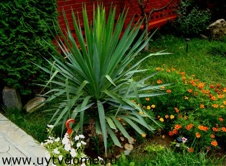 Для контраста с зеленой травкой, можно высадить ряд оранжевых цветов, к примеру: калифорнийскую календулу, бархатцы, настурцию, примулу и так далее. Пышные, неприхотливые кусты так же будут прекрасно смотреться на участке.