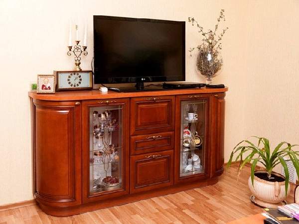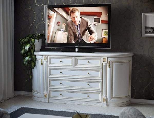 В просторном помещении можно установить подставку под ТВ в виде комода. Этот вариант существует уже десятилетия, но не теряет своей актуальности. Такая тумба под телевизор довольно вместительная, но, вместе с тем, занимает много места, поэтому речь и идет об их установке в просторных гостиных или спальнях. Преимущество такой конструкции заключается еще и в том, что устанавливать на ней можно не только плазму, но и более объемные телевизоры, которые имеют место во многих домах.