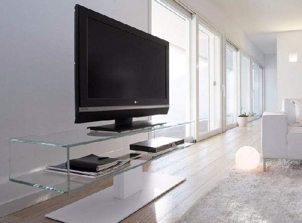 Стеклянные тумбы под телевизор (как видно на фото) создают ощущение невесомости. Они, практически, незаметны в интерьере, за счет чего не загромождают пространство. Для таких конструкций используются закаленные материалы, что дает возможность выдерживать вес даже крупногабаритной техники. За счет прозрачности, стеклянные модели подойдут к любой цветовой гамме интерьера.