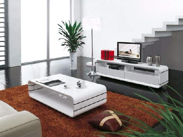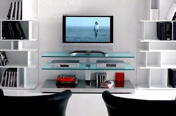 Помимо классики, существует довольно много современных направлений, основной особенностью которых является многофункциональность и лаконичность в дизайне, исключение каких-либо излишеств. Тумба под телевизор в современном стиле минимализм будет отличаться крайней простотой. Это может быть, например, стеклянная конструкция, состоящая из двух полок с хромированным стояком. Реже встречаются модели из дерева или ДСП. В этом случае цвет тумбы должен гармонировать с техникой, при этом возможны сочетания белого с металликом или черным.