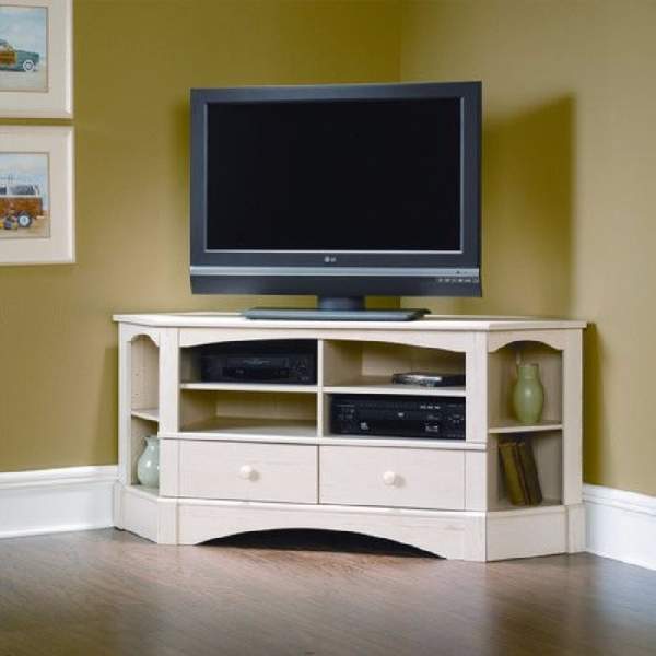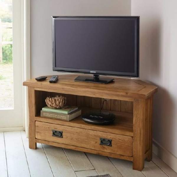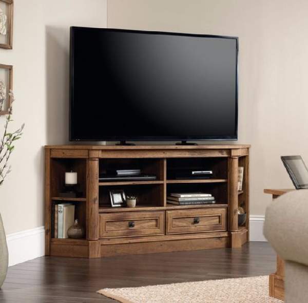 Модели тумб, рассчитанных под установку в угол, являются одним из самых практичных вариантов, которые позволяют эффективно сэкономить пространство, поэтому хорошо применимы для комнат разной площади, как больших, так и маленьких. Кроме того, имеющая достаточно полочек и секций, угловая тумба под телевизор, как видно на фото, очень вместительная.