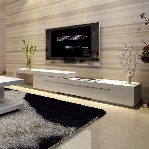 Оптимальный вариант для хай тека — тумбы под телевизор современные длинные (фото таких моделей размещено в статье), которые комбинируются с вертикальными элементами. Они могут быть выполнены из любого материала, отличного от природного. В редких случаях возможно использование дерева, но, при этом, оно должно быть максимально «замаскировано» — окрашено в яркий цвет или иметь акриловое напыление.
