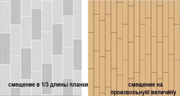Если укладка ПВХ плитки будет производится своими руками и вы используете «дощечки», имитирующие древесину, опыта работы с подобным материалом нет, лучше начинать с простейшей схемы — со смещением. Для такого способа укладки лучше, если смещение произвольное — не видно стыков. При использовании этой схемы важно только чтобы стыки «дощечек» были разнесены не менее чем на 15 см. Такой способ укладки еще и экономный — отрезанный кусок с последнего элемента в ряду может служить стартовой плашкой в следующем (или через один, если стык получается ближе чем через 15 см). Другие распространенные варианты смещения — на 1/3 и 1/2 длины доски. В этом случае рисунок более регулярный и стыки больше выделяются.