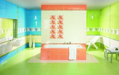 Так, при использовании высокой прямоугольной плитки, уложенной вертикально, можно добиться визуального увеличения высоты потолка. - Цвет. В продаже имеется однотонная глянцевая и матовая плитка, а также кафель с орнаментом. Выбор зависит от стиля оформления, цвета сантехники и мебели. Имеется в продаже и декоративная плитка для ванной в виде панно, а также разнообразные бордюры, которые помогают создать законченную композицию.