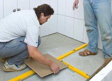 Перед тем, как начнется укладка напольной плитки в ванной, проводится ряд подготовительных операций. Пол требуется выровнять при помощи новой стяжки и покрыть грунтовкой.
