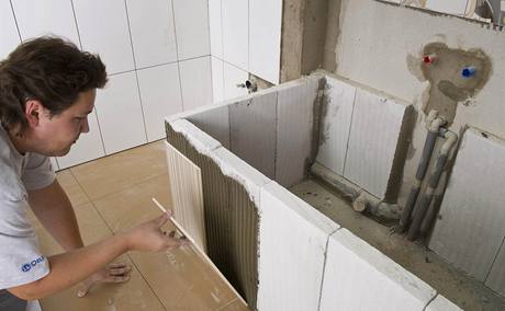 Можно использовать и готовые экраны под ванну раздвижные, которые продаются в магазинах. Затем на это основание наносится клеевой состав шпателем, после чего производится укладка плитки вокруг ванны. Делается этот так же, как и при укладке плитки на стены.
