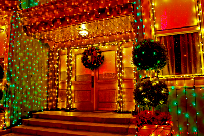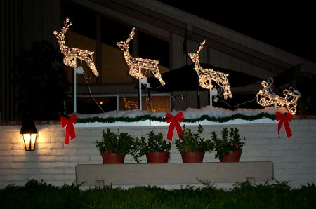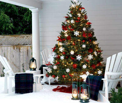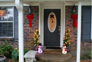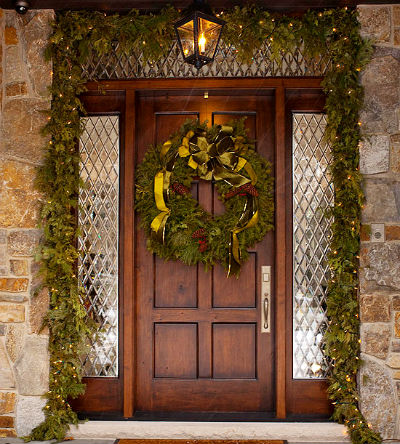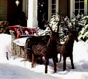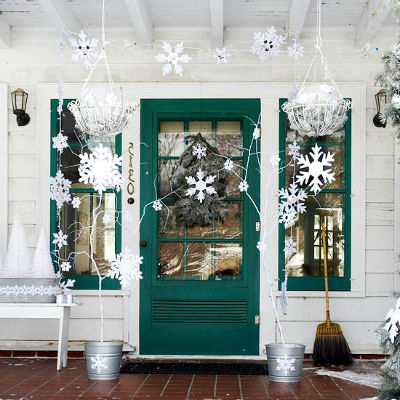 На входной двери следует повесить рождественский венок, созданный собственными руками: из еловых веток, украшенный бантиками, шишками, елочными шариками и светящейся гирляндой. А на порожках, с двух сторон установить невысокие елочки и нескольких маленьких, надувных снеговиков. Кроме того не забудьте декорировать окна дома, для этого можно повесить снежинки на леску и закрепить их сверху окна на скотч. Возле порога установить плетеную упряжку Деда Мороза или Санта-Клауса (кому — кто ближе), с такими же плетеными, запряженными ретивыми конями или оленями.
