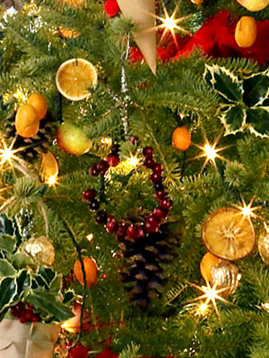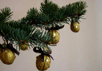 В ход можно пустить еловые шишки, желуди и каштаны, собранные осенью в лесу, их можно покрыть блестками, которые затем закрепить строительным лаком. Кроме того можно изготовить бумажные гирлянды из плотной цветной бумаги или засушить кружочки апельсина. Также зеленую красавицу необходимо украсить светящимися, уличными гирляндами. А под елочкой можно поставить символические подарки — красиво упакованные картонные коробки.