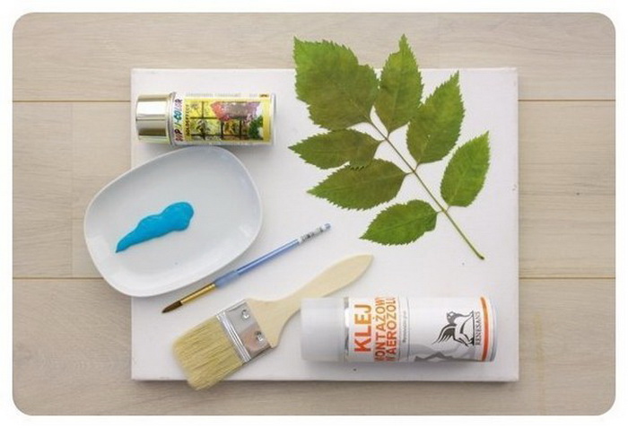 Для изготовления декоративной картины на стену Вам понадобятся следующие материалы: дощечка или картонка, ткань, золотая краска-спрей, краска для основы, кисточка, бумажный клей, веточка любого дерева.