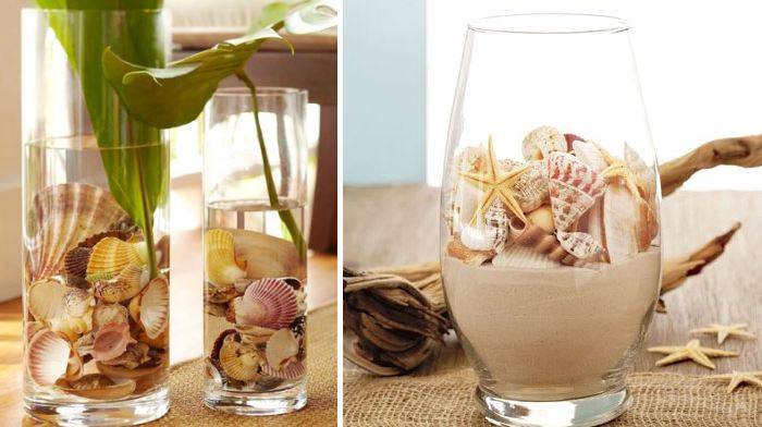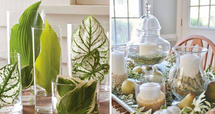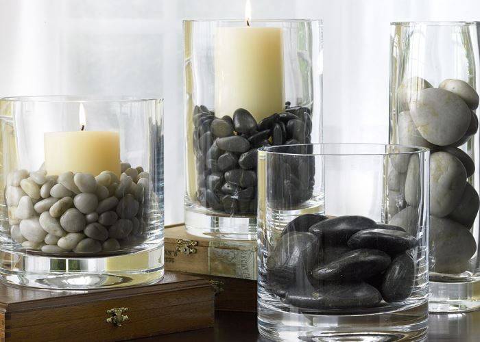 Сосновые шишки, сухие ветки, камни, желуди, ракушки — все это и многое другое может прекрасно послужить вам в качестве декоративных материалов для украшения дома. Просто наполните ими стеклянные сосуды, создайте небольшой «сад камней», оформите красивое блюдо со свечами или изготовьте более сложные поделки, например, коллажи, гирлянды и т. п. — вашей фантазии есть, где разгуляться!