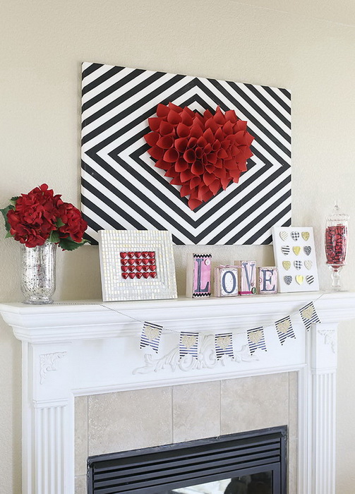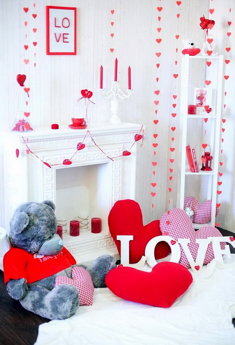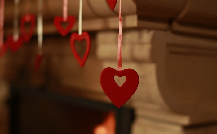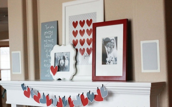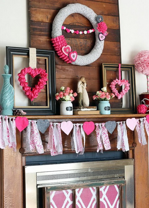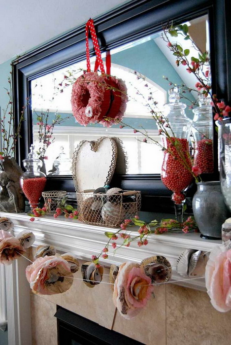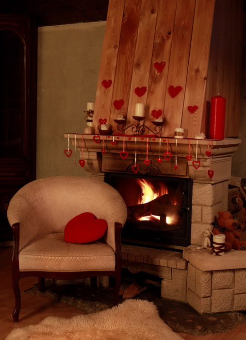 День святого Валентина – это обилие валентинок, сердечек, бусинок. Для создания праздничного дизайна интерьера в зоне камина можно использовать купленные готовые изделия, или проявить творческую фантазию и свое умение мастерить различные поделки и аппликации.