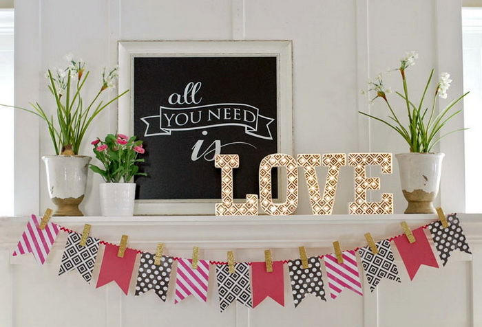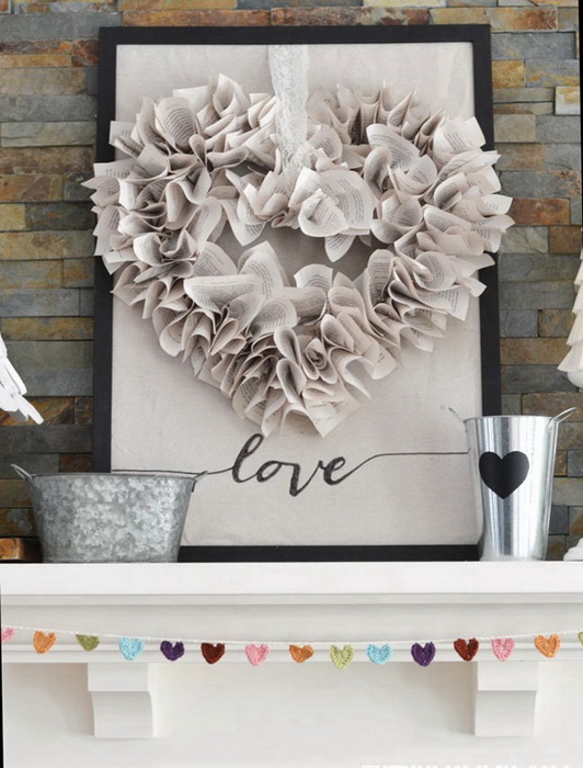 Красиво смотрятся бумажные гирлянды. Они могут быть грубоватыми или нежными. Достаточно вырезать сердечки узорами, как бумажные снежинки, чтобы они стали воздушными.