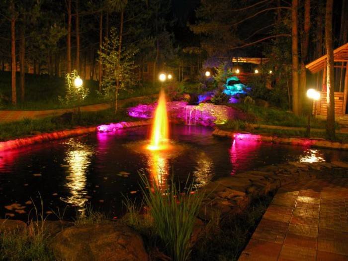 Сад можно визуально расширить при установке светильников по естественным изгибам дорожек. Особенно красивы подвесные светильники. Для светового акцента на ландшафте, отлично подойдут грибовидные модели и световые тумбы.