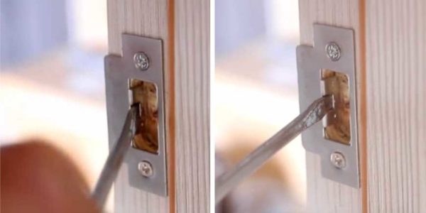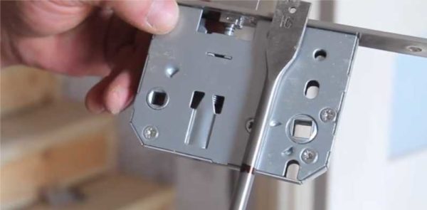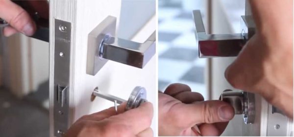 Замки для межкомнатных дверей, обычно имеют с одной стороны поворотную щеколду (завертку), которая запирает замок, с другой стороны есть только накладка с прорезью. То есть снаружи двери просто так не откроешь — нужен специальный ключ. Установка этой части замка занимает буквально пару минут, но есть нюансы.