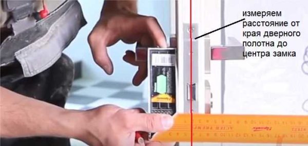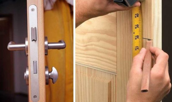 Перед тем как врезать замок в межкомнатную дверь, отмечаем выбранную высоту на двери. Сделать это удобнее при помощи рулетки. Отметку ставим на торце, переносим при помощи угольника или строительного уровня на обе стороны дверного полотна.