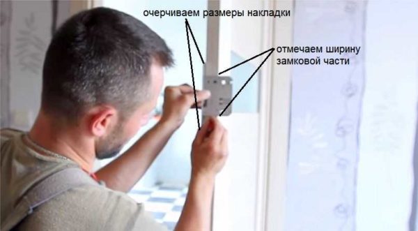 Ответную часть надо установить четко, чтобы двери не люфтили и не было проблем с закрыванием. Поэтому стараемся отмечать как можно точнее и берем остро отточенный карандаш.