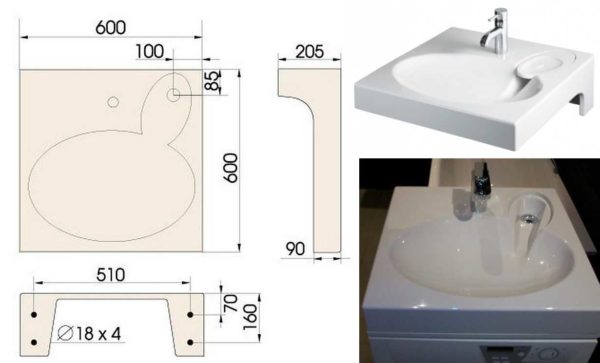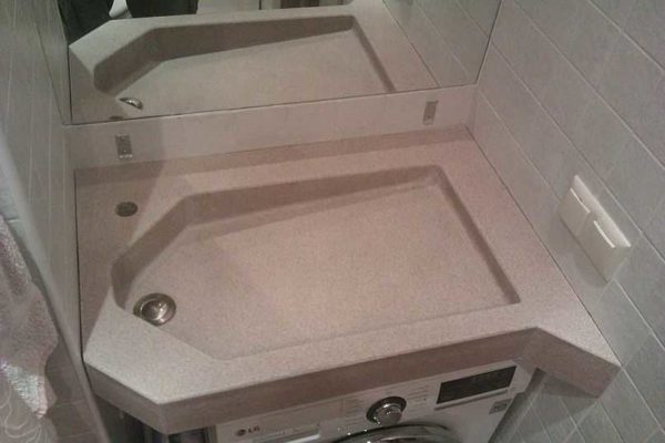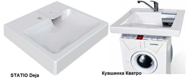 От обычных раковина над стиральной машиной отличается меньшей глубиной чаши, большими размерами и сливом особой формы. Чаша делается максимально плоской. В среднем ее высота вместе с выступом слива около 20 см.
