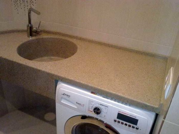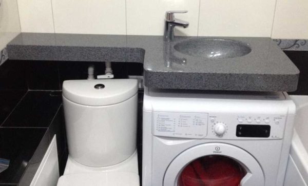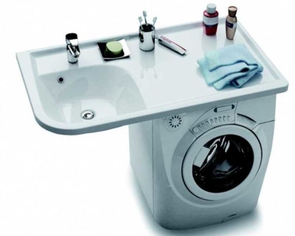 Если положение с местом в ванной или санузле не столь критическое, можно установить раковину над стиральной машиной со столешницей. Машину устанавливают под столешницу. Это вариант с точки зрения электробезопасности наиболее предпочтительный. Есть один минус — раковины со столешницей стоят дорого.