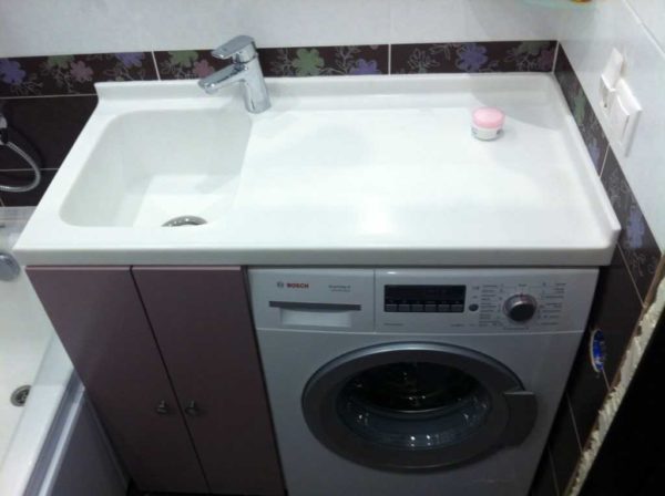 Под раковину-кувшинку устанавливать можно малогабаритные стиральные машины. Они должны быть невысокими и неглубокими. Для людей среднего роста умывальники в ванной комнате устанавливают на высоте 80 см. С учетом того, что раковина имеет высоту около 20 см, высота стиралки должна быть около 60 см. Для высоких людей нормальная высота установки раковины — до 100 см. В этом случае стиральная машина может быть высотой около 80 см.