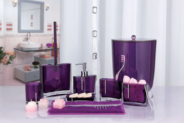 Аксессуары, которые подходят к дизайну фиолетового тона ванной комнаты:
