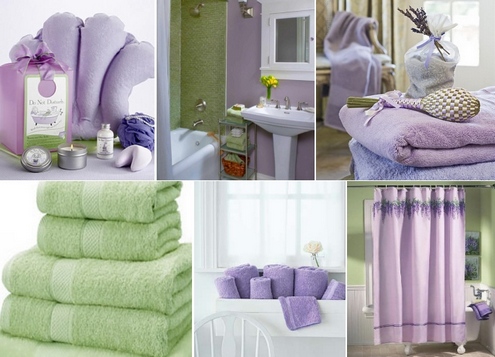 • Красивая ванная комната фиолетовая при сочетании с нежным зеленым цветом превращается в прекрасную ванную в стиле SPA. Такая гармония двух цветов, напоминает лаванду, которая активно применяется при выпуске разнообразных средств по уходу за телом, для принятия водных процедур и SPA.