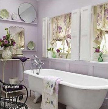 • Используя тонкую полоску, клетку или фиолетовые мелкие цветы можно оформить ванную комнату в стиле кантри.