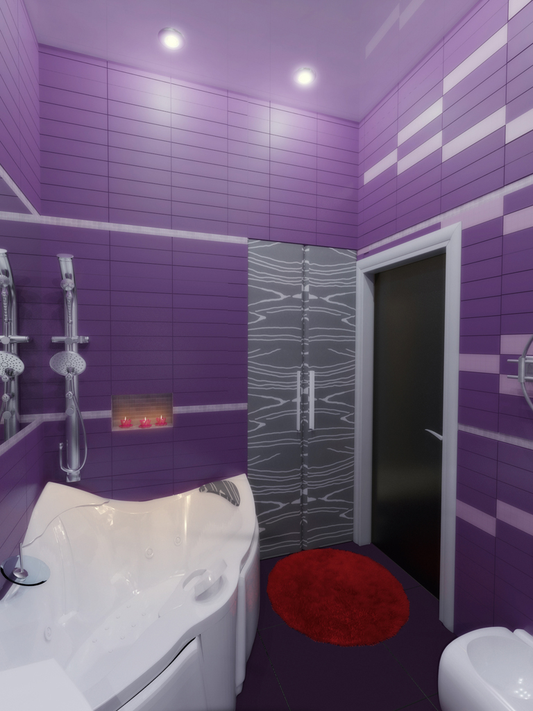 Стильно выглядит ванна фиолетовая, в которой  такого цвета не только пол и стены, а также большая часть сантехники.