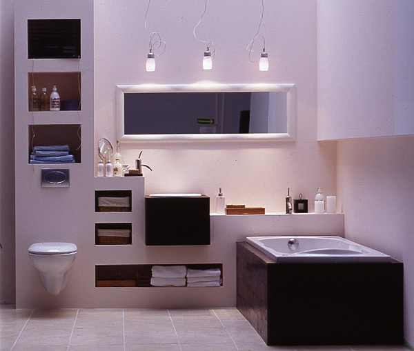 Основными компонентами дизайна ванной в этом стиле, являются: