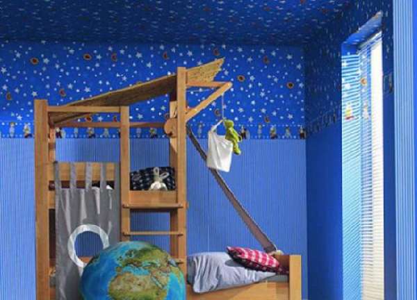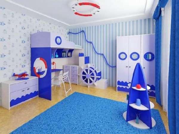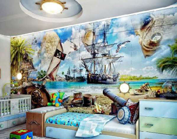 Нужно отдать дань традициям, ведь для мальчиков как нельзя лучше подойдут обои голубого и синего цветов. Кстати, в такой цветовой гамме можно поклеить фотообои в морском стиле в детскую комнату. Вы можете посмотреть, как выглядит такой интерьер на фото ниже. Морская тематика для детских фотообоев — замечательная идея оформления комнаты для ребенка до 9 лет.