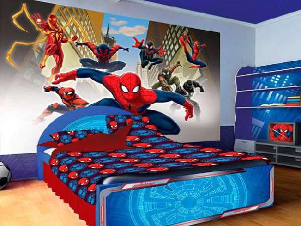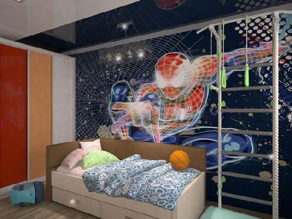 На этом фото ещё один пример удачного оформления комнаты для мальчика. И действительно, фотообои с человеком пауком в интерьере детской комнаты — это замечательная идея. Многие мальчики любят этого вымышленного героя и будут рады такой комнате. Детские фотообои человек паук прекрасно сочетаются с постельным бельем и мебелью такой же тематики.