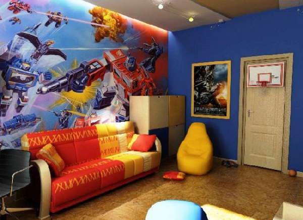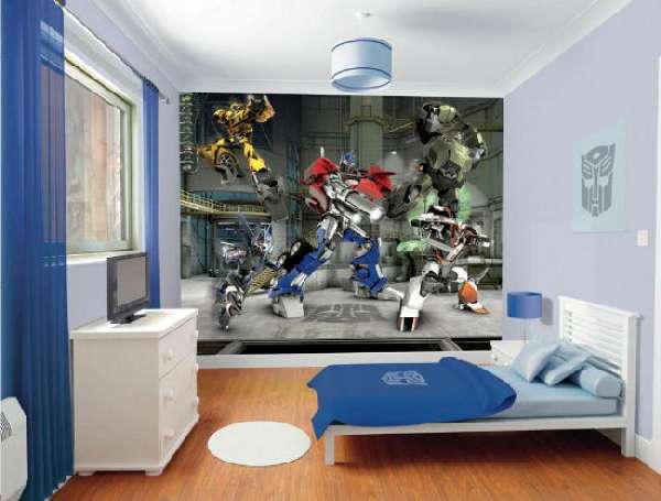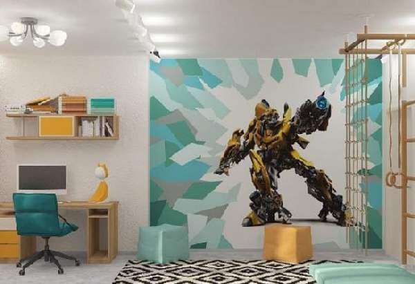 Не менее интересно будут смотреться фотообои с трансформерами в детской комнате. Дети в возрасте от 6 до 12 лет могут всерьёз увлекается вымышленными героями, а значит будут довольны таким оформлением комнаты.