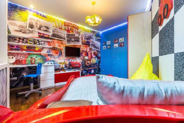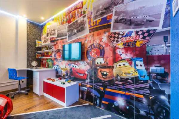 Ещё один по-настоящему мальчишеский вариант — фотообои тачки в интерьере детской (пример на следующих фото). Ребенок, безусловно, будет доволен таким оформлением его комнаты. Детские фотообои с машинками — это классика для мальчишек, поэтому выбрав их, вы не ошибетесь.