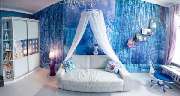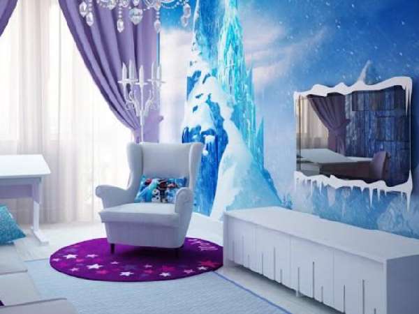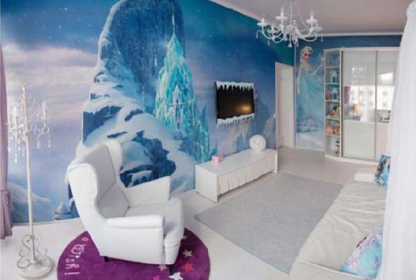 А вот, пожалуй, самый необычный вариант — детские фотообои холодное сердце. У вашей дочери обязательно возникнет ощущение сказки, если она попадет в такую комнату. Дальше можно увидеть несколько примеров.