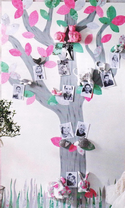 Еще вариант, создать генеалогическое дерево, состоящее из нарисованного дерева на стене и соответственно расположенных фотографий.