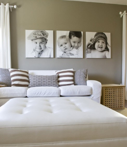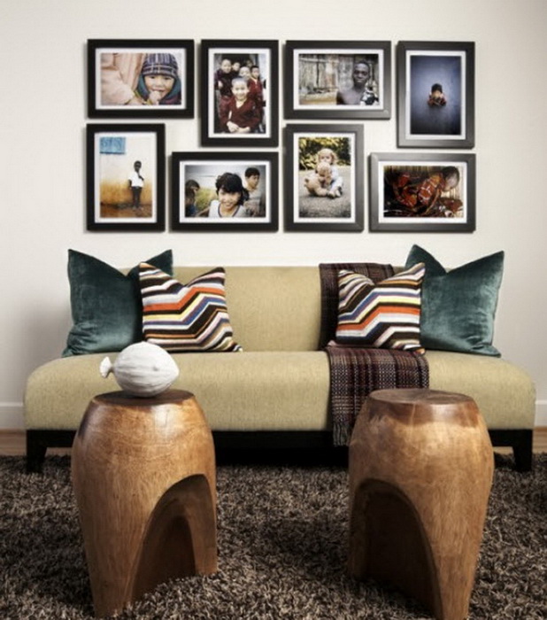 В гостиной прекрасно будет смотреться композиция «часы». Вокруг часов располагают фотографии. Смотрится достаточно оригинально. Также в гостиной интересен вариант фотопортретов, расположенных как картины и выдержанных в одном стиле. Если в доме есть вязальщица, и гостиная в стиле хендмейд, то прекрасно будут смотреться связанные в ручную, фоторамки.