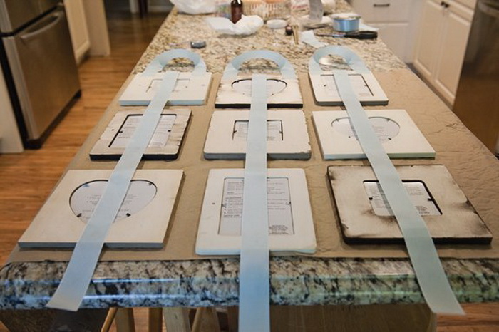 3.На рамках верхнего ряда из атласной ленты сделайте петли для подвеса, остальные соедините между собой лентой, как показано на фото (с помощью клея или степлера).