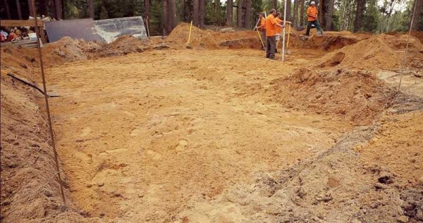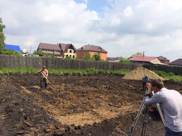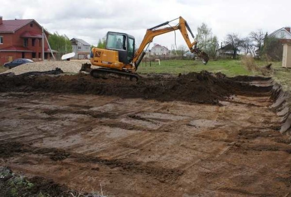 Размеры котлована под монолитную плиту должны быть больше самого здания, как минимум, на 1 метр. На этом участке полностью снимается плодородный грунт. Его толщина в разных регионах разная — от 20-30 см до 50 см и больше. В любом случае убирают все.