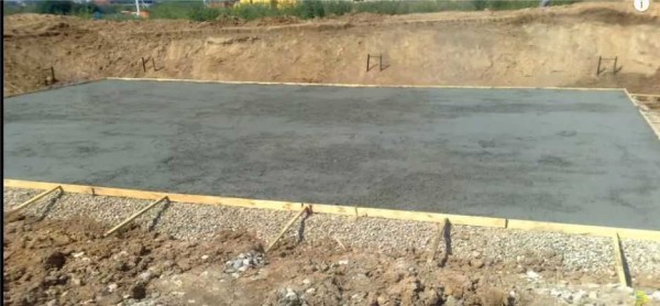 На утрамбованный гравий наливают слой бетона 100 мм. Это может быть бетон невысоких марок — В7,5 — В10. Бетонная подготовка будет надежной основой для укладки гидроизоляции и утеплителя, также служит для более равномерного распределения нагрузки от дома.
