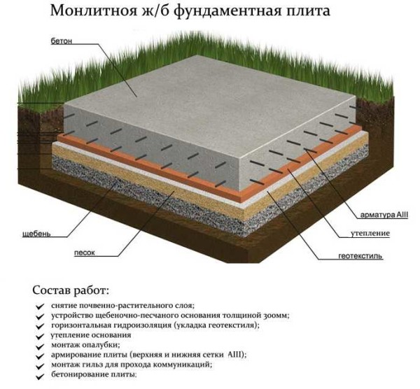 Монолитная плита под дом относится к плавающим незаглубленным фундаментам, бывает также мелкого заложения. Название свое получила из-за того, что железо-бетонная основа заливается под всю площадь дома, образуя большую плиту.