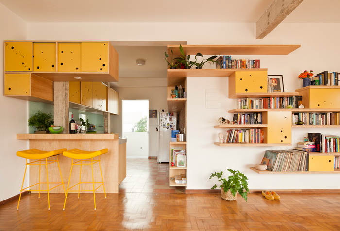 Для достаточно широких арок можно соорудить по бокам стеллажи или отдельные полки, что позволит не только сузить проем, но и использовать его дополнительные возможности. Например, разместить там книги, коллекции, посуду с подсветкой и даже телевизор для кухни. При желании часть полок можно сделать глухими (для создания некоторой приватности), но чаще они бывают открытыми для доступа света в помещение. Хорошо подходит для комнат, объединенных с балконами или лоджиями; да и в любом помещении освобождается пространство для обустройства.