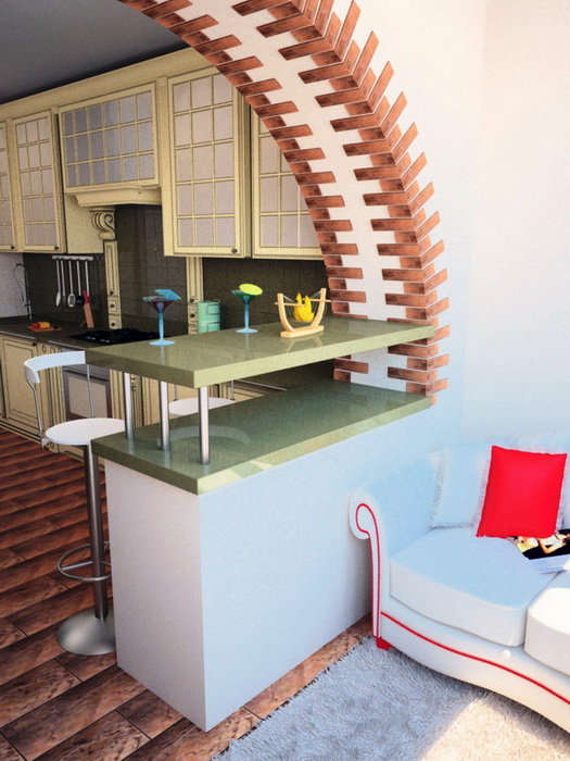 Эффектное и модное решение для квартиры-студии на границе кухни и гостиной; да и в солидных апартаментах с кухней и столовой оно придется к месту. В маленьких кухнях это еще и вариант разделочного или обеденного стола. Кроме столешницы там может быть полка для фужеров и стойка с хранилищем для напитков. А если основание достаточно широкое, то межкомнатная арка может быть предназначена и для установки встроенного винного шкафа-холодильника.