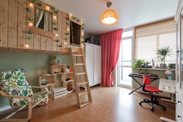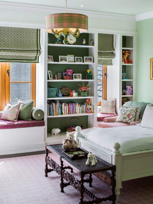 В отличие от резкого салатового, мятный оттенок зеленого не надоедает со временем и легко освежает интерьер, благодаря чему его можно использовать в сочетании с теплыми и яркими тонами, например, розовым. Такой выбор цвета для детской комнаты, в первую очередь, походит для девочки, но если сменить розовый на более смелый красный, то вполне может сгодиться и для мальчика.